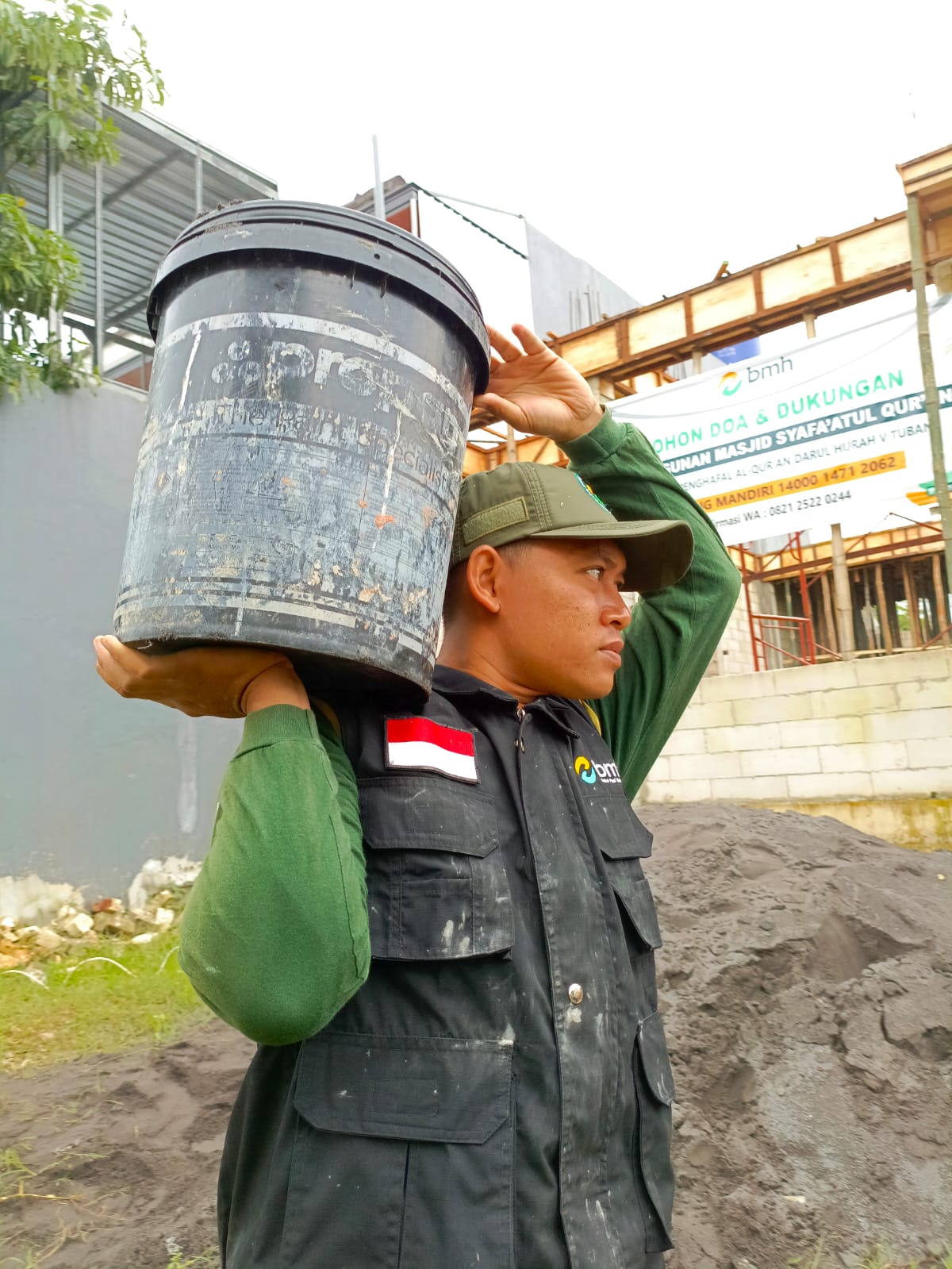Di sini, identitas kami melebur. Teman saya yang dikenal punya hafalan paling lancar, kini berlumuran semen. Saya sendiri, yang biasanya memimpin halaqah, harus rela bahu-membahu mengoper ember estafet.